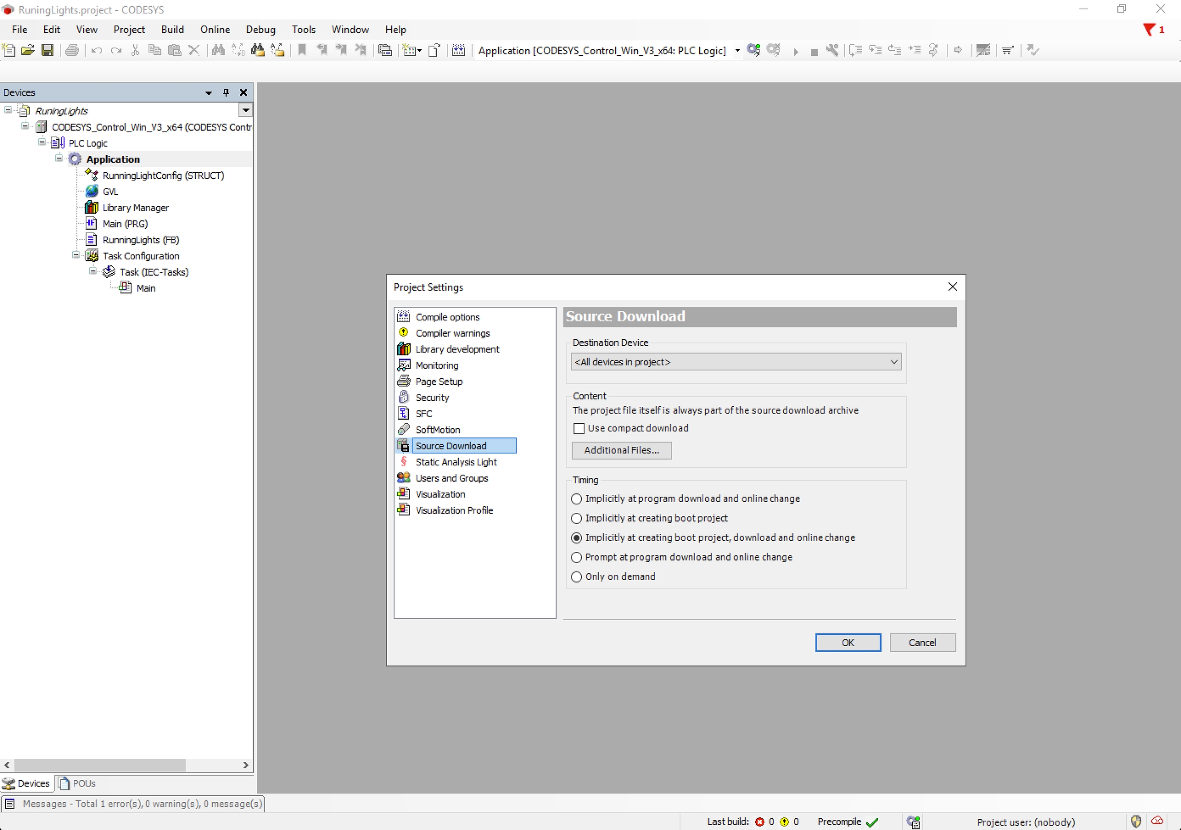 In order to make a CODESYS project backup, the project must be configured to do a source download every time a change is deployed to the device.