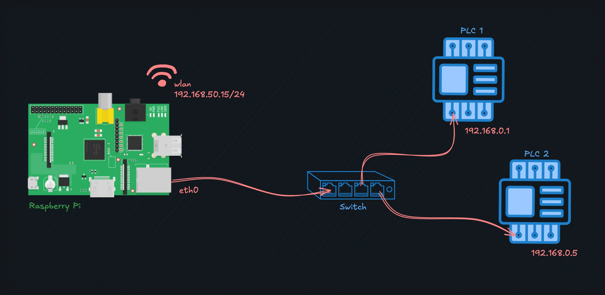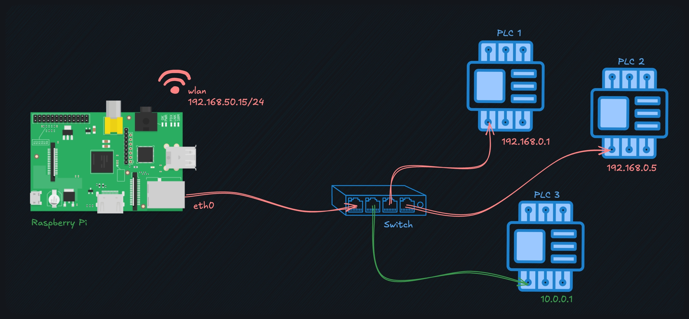 Since PLC 1 has the IP 192.168.0.1 and PLC 2 has 192.168.0.5, it is reasonable to say that both are in the network 192.168.0.0/24 . Therefore, the Raspberry Pi needs to join this same network and correctly route the packages to the PLCs. Because our WLAN is 192.168.50.0/24 , there is no route collision.